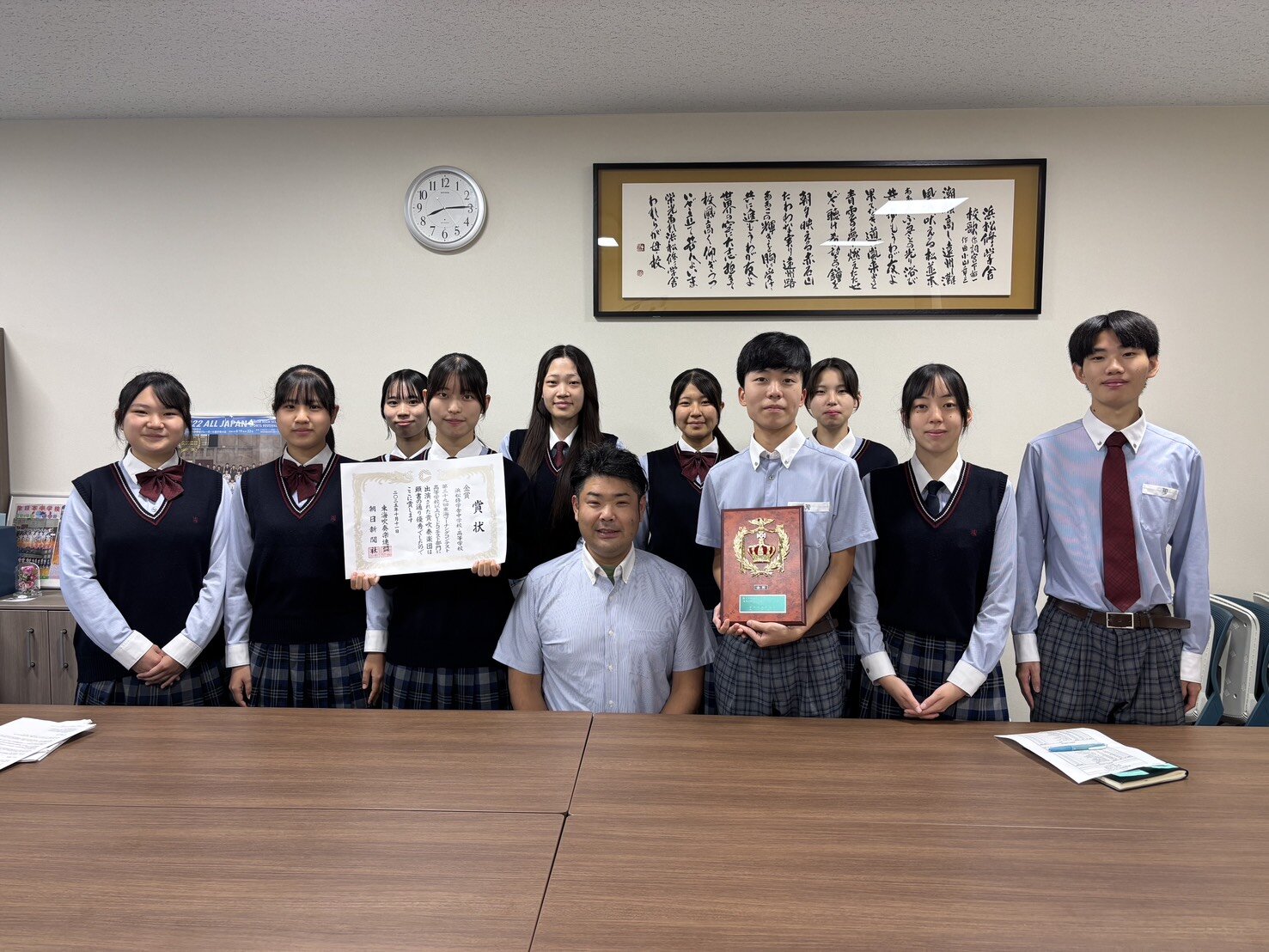 先日「第 39 回東海マーチングコンテスト」で金賞を受賞し全国大会進出を勝ち取った吹奏楽部が、学校長へ結果報告に行きました。