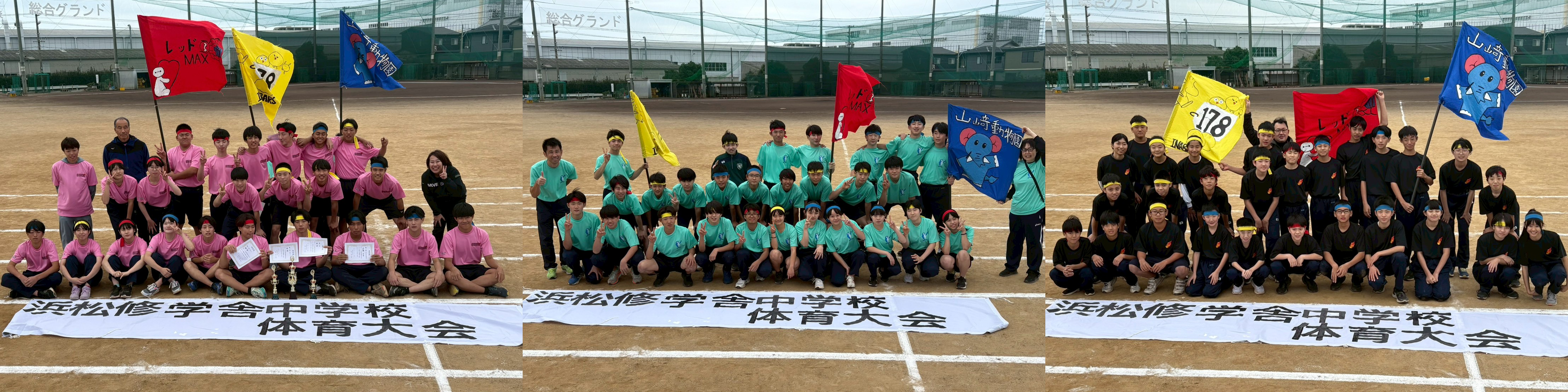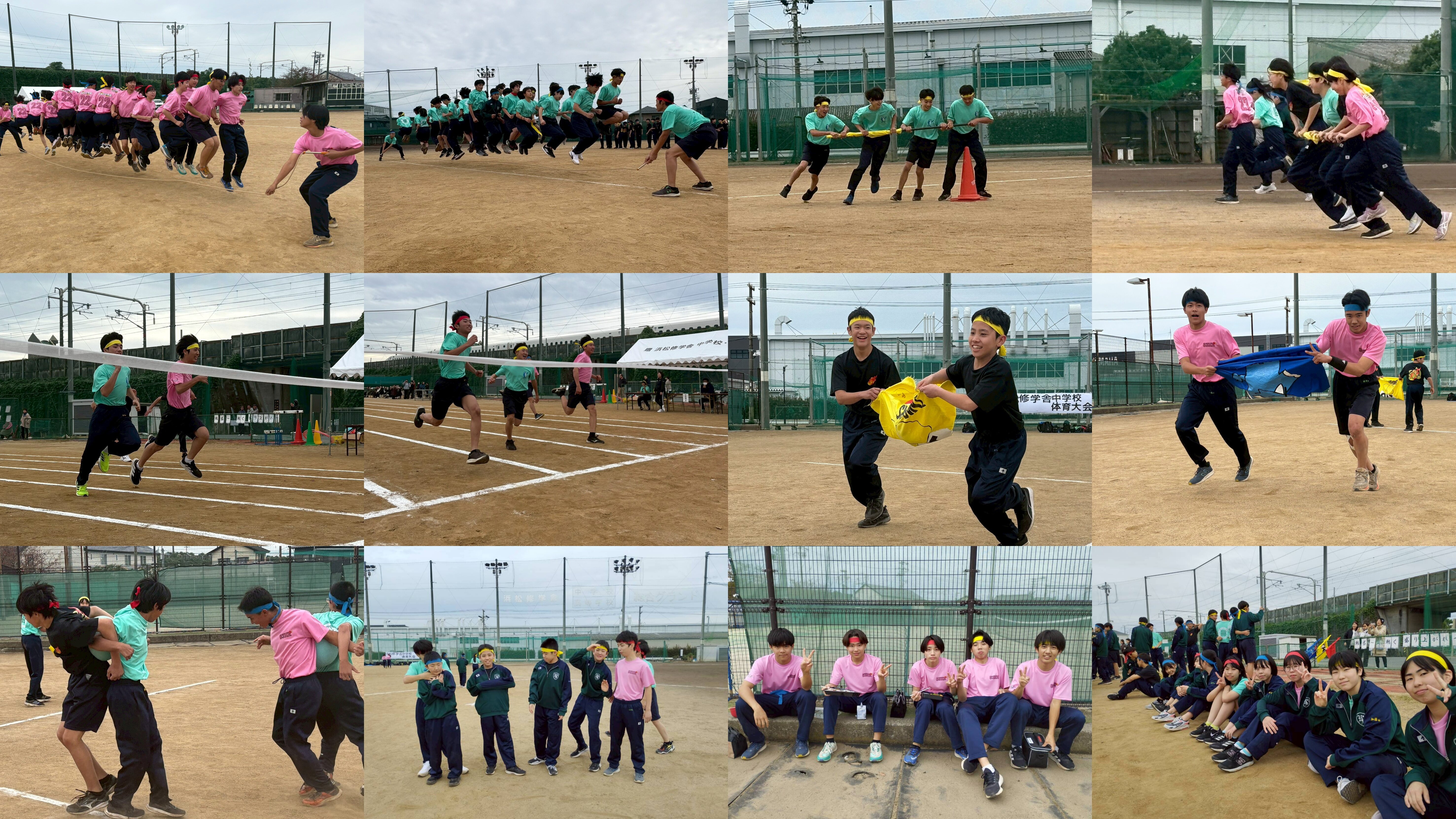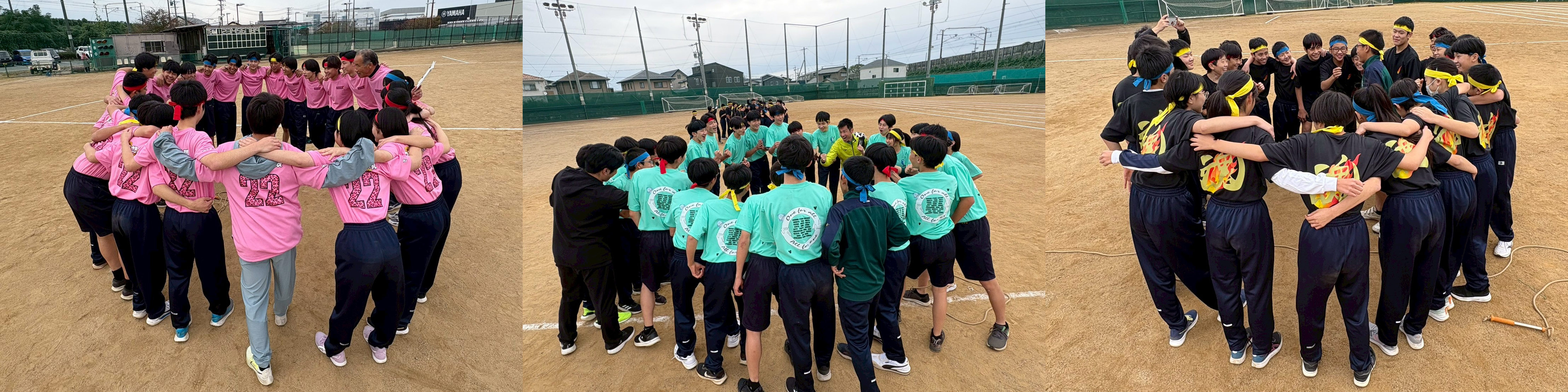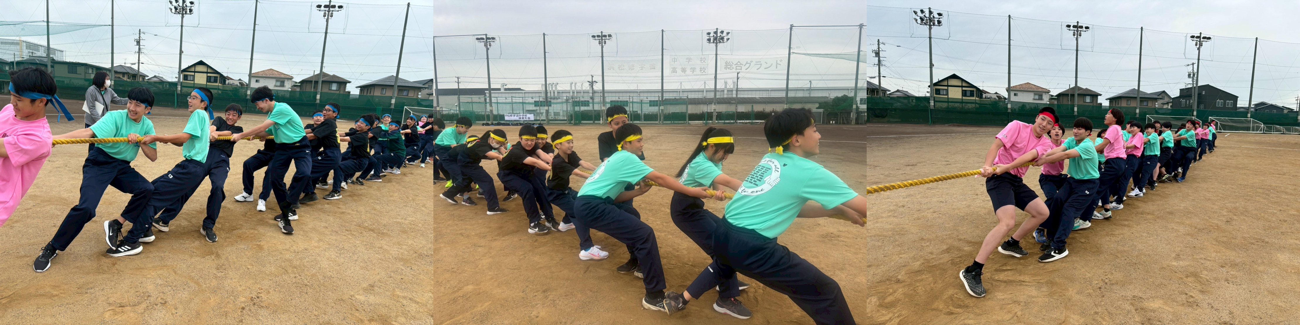 11月13日(木)に中学部の体育大会が総合グラウンドで行われました。1~3年生が縦割りで赤・黄・青の各団にわかれる体育大会。団の色のはちまきを身につけ、Tシャツは学年でそろえ、一体感を作りました。中学部会長からは今回のスローガン「熱盛~熱く盛り上がれ~」に見合う大会になるようにしよう、体育大会実行委員長の中谷君からは「協力すること・励ましうあうことが大切」という話をしてくれました。挨拶のあとは、団長の堂々とした選手宣誓がありました。とてもいい雰囲気の中スタートした体育大会。初めの競技は綱引き。みんなで声を合わせ、引き合う綱はとても均衡していました。赤団がとても強く、息がぴったり声を合わせて引いていました。