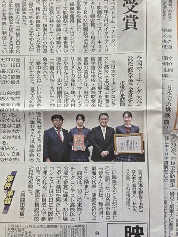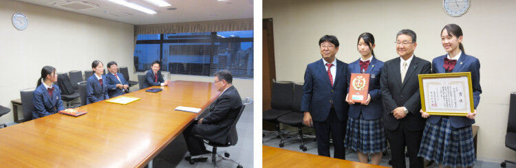 全日本マーチングコンテスト出場に伴い、野中那々美部長(3年)、金村志歩マーチングリーダー(2年)が11月12日(水)、山名裕浜松市副市長を表敬訪問しました。