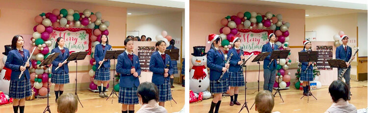 その後はサンタクロースの帽子をかぶり、クラリネット五重奏によるクリスマスメドレーや、サクソフォン五重奏による「星に願いを」など、親しみのある楽曲を演奏し、会場は温かなクリスマスムードに包まれました。